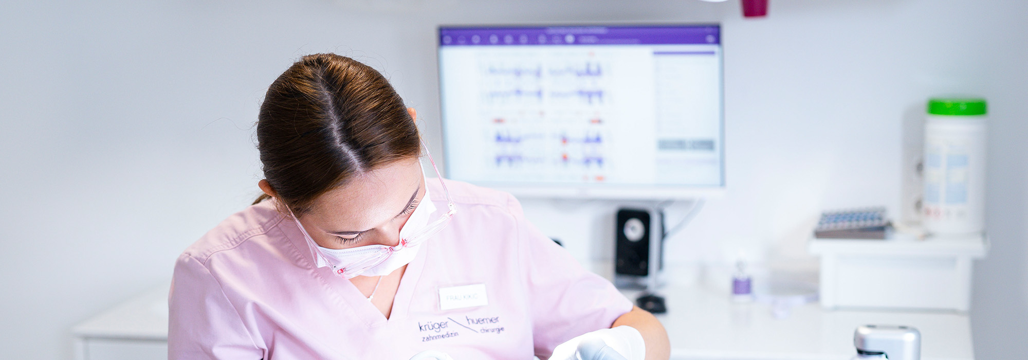 Das 3D-Röntgen mit DVT liefert in wenigen Sekunden präzise, dreidimensionale Bilder von Zähnen und Kiefer. Die Strahlenbelastung ist deutlich geringer als beim CT. DVT ermöglicht eine exakte Diagnostik und sichere Planung bei Implantaten und chirurgischen Eingriffen