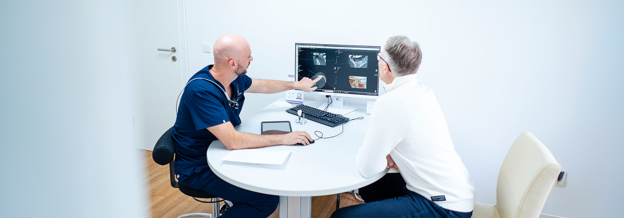 Das 3D-Röntgen mit DVT liefert in wenigen Sekunden detailreiche, dreidimensionale Bilder von Zähnen und Kiefer. Die Strahlenbelastung ist deutlich geringer als beim CT. DVT ermöglicht präzise Diagnosen und eine sichere, schonende Planung von Eingriffen